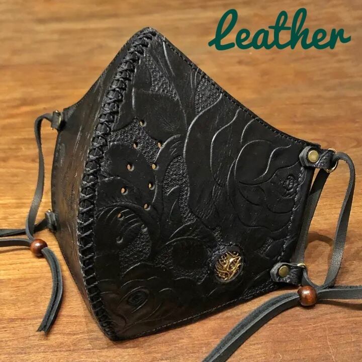 [本革] レザーマスク ファッションマスク 薔薇柄 メタル装飾 ブラック