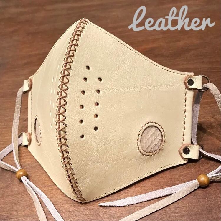 [本革] レザーマスク ファッションマスク パイソン革装飾 アンティーククリーム色